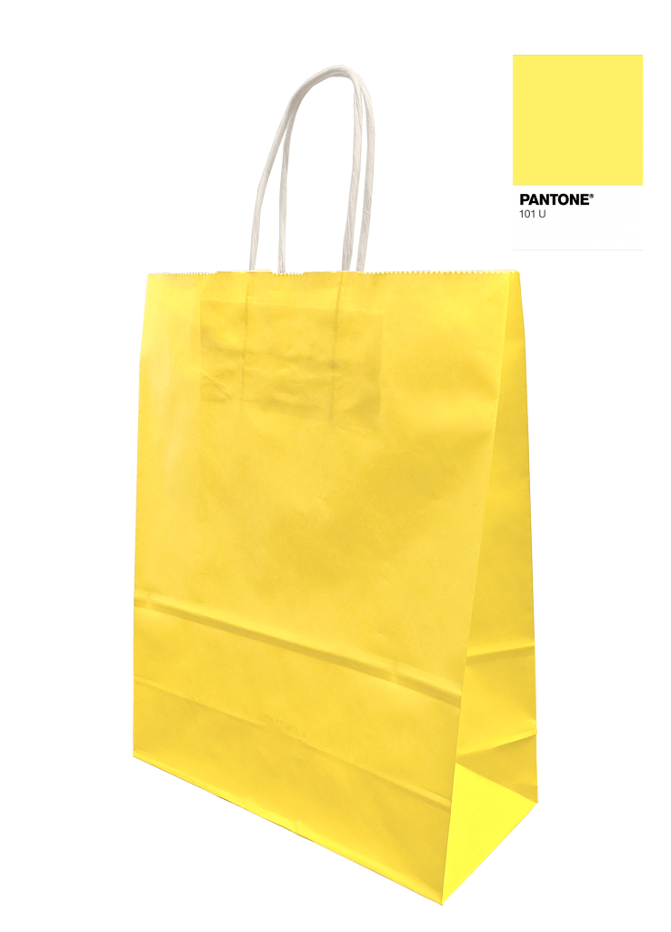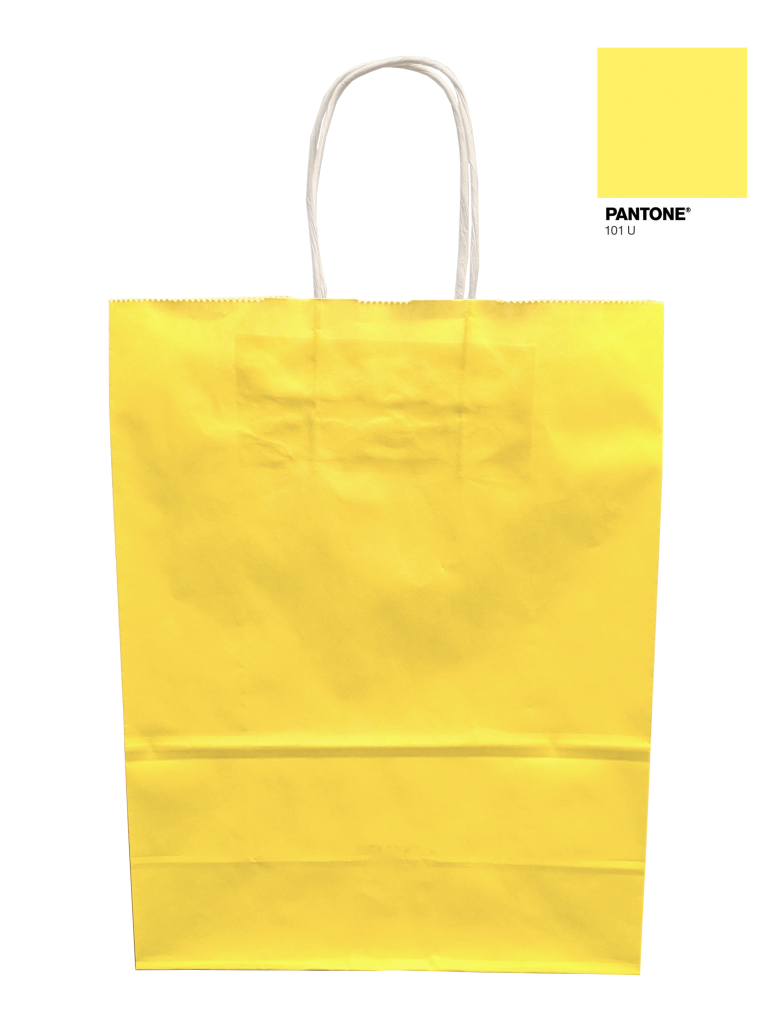 Gul papperskasse i kraftigt kraftpapper med vita tvinnade handtag.