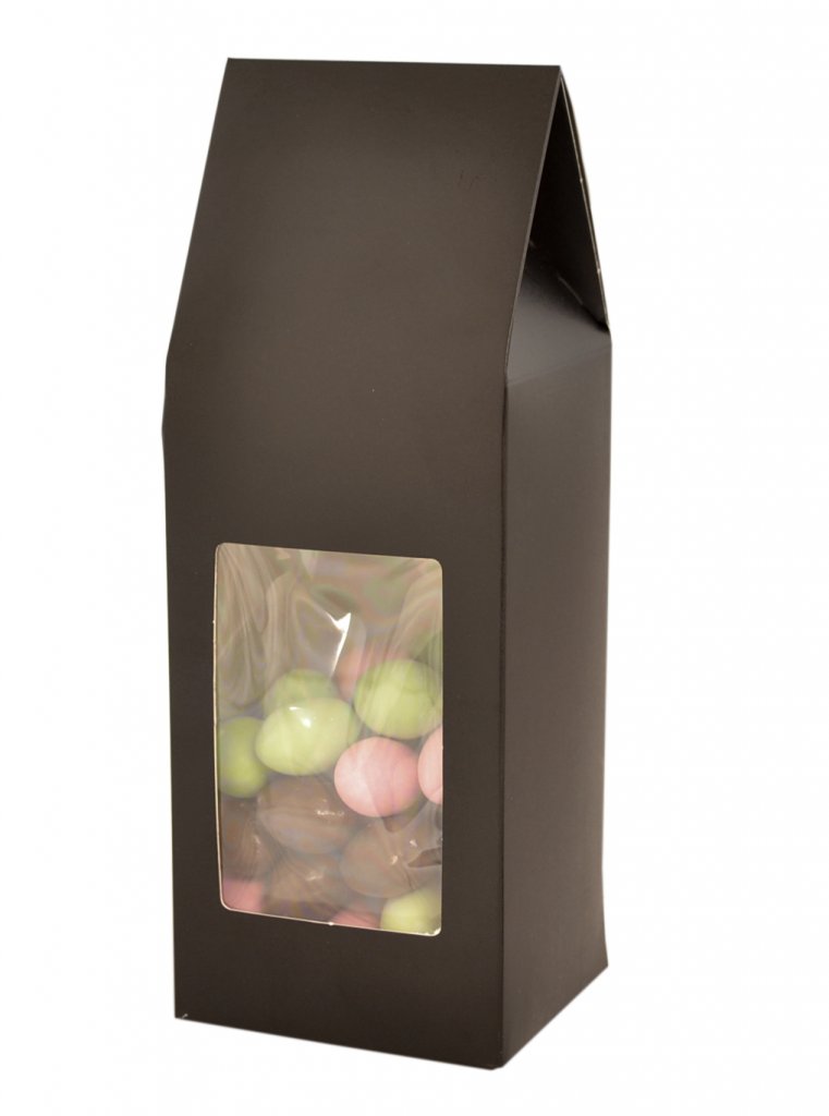 Elegant och stilren svart kartong med fönster – perfekt för konfektyr, småpresenter, delikatesser eller exklusiva produkter. Det integrerade plastfönstret ger en tydlig insyn till innehållet, vilket gör den idealisk för både butiksexponering och gåvoförpackningar